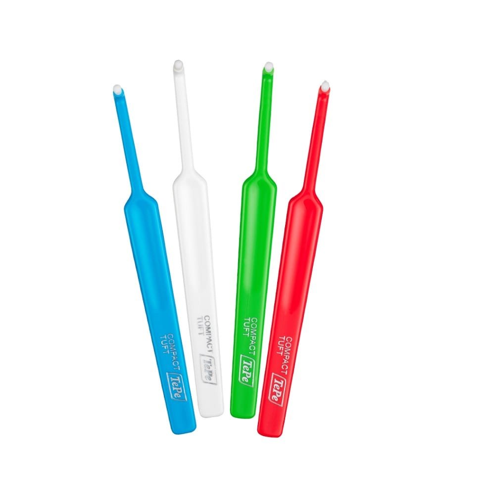 The TEPE Compact Tuft toothbrush is designed for precision cleaning of difficult areas, such as braces, implants, and along the gum line. Its small, rounded tuft allows for targeted dental care.