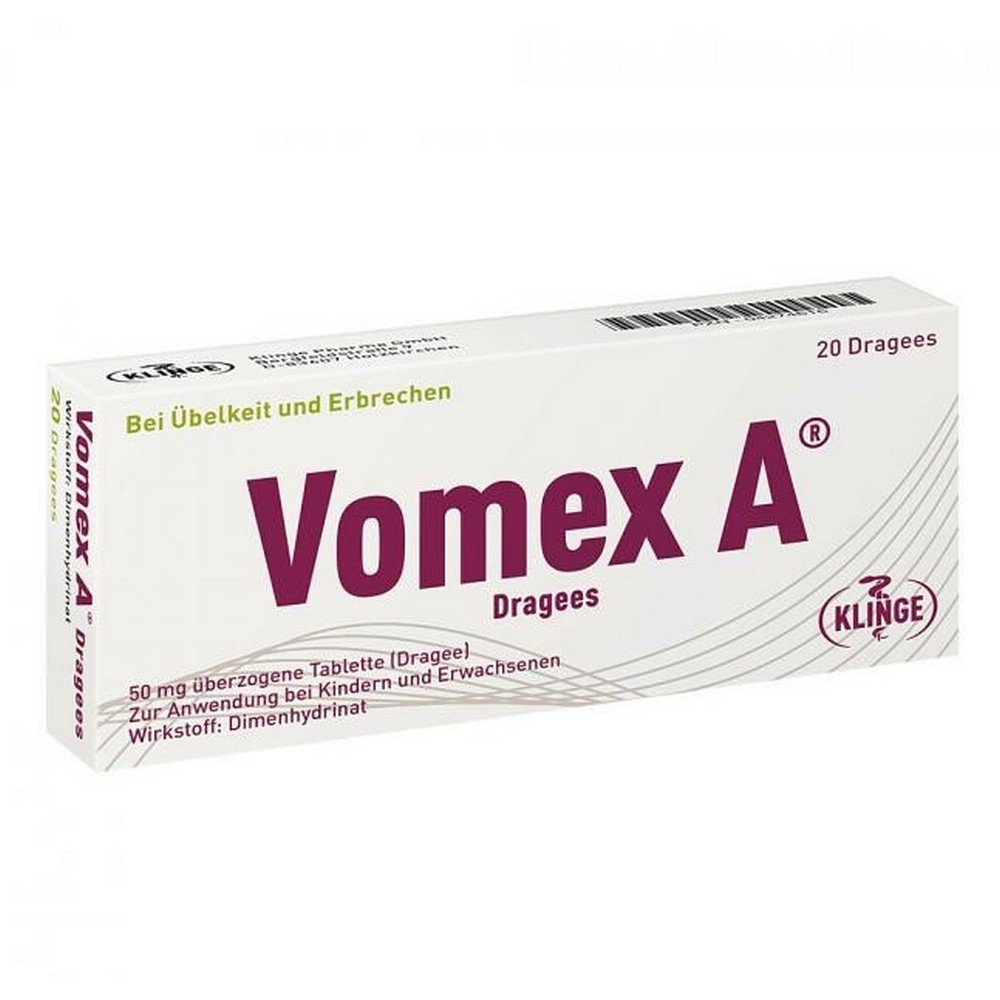 Unless otherwise prescribed by a doctor, the drug is intended for short-term use only. Therefore, you should consult your doctor if the symptoms persist. At the latest after 2 weeks of treatment, your doctor should check if treatment is required.nnCoated tablets should be swallowed whole with plenty of liquid. As a prophylaxis against motion sickness, the first dose is administered approximately 1/2 to 1 hour before the start of travel. For the treatment of nausea and vomiting, doses are distributed at regular intervals throughout the day.nnDrugs against nausea and vomiting from the group of H1 antihistamines. Used to prevent and treat nausea and vomiting of various origins, especially in motion sickness.Buy VOMEX A dragees 50 mg coated tablets, 20 pcs
