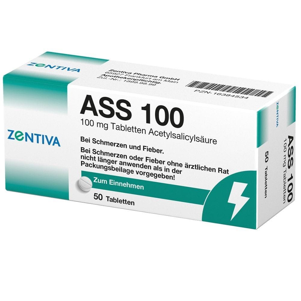 ASS 100 tablets. Active ingredient: acetylsalicylic acid. Areas of application: For mild to moderate pain and fever. Warnings: If you have pain or fever, do not use it for longer than stated in the package leaflet without medical advice! Note leaflet. For information about risks and side effects, read the package leaflet and ask your doctor or pharmacist. Zentiva Pharma GmbH. As of 12/2020