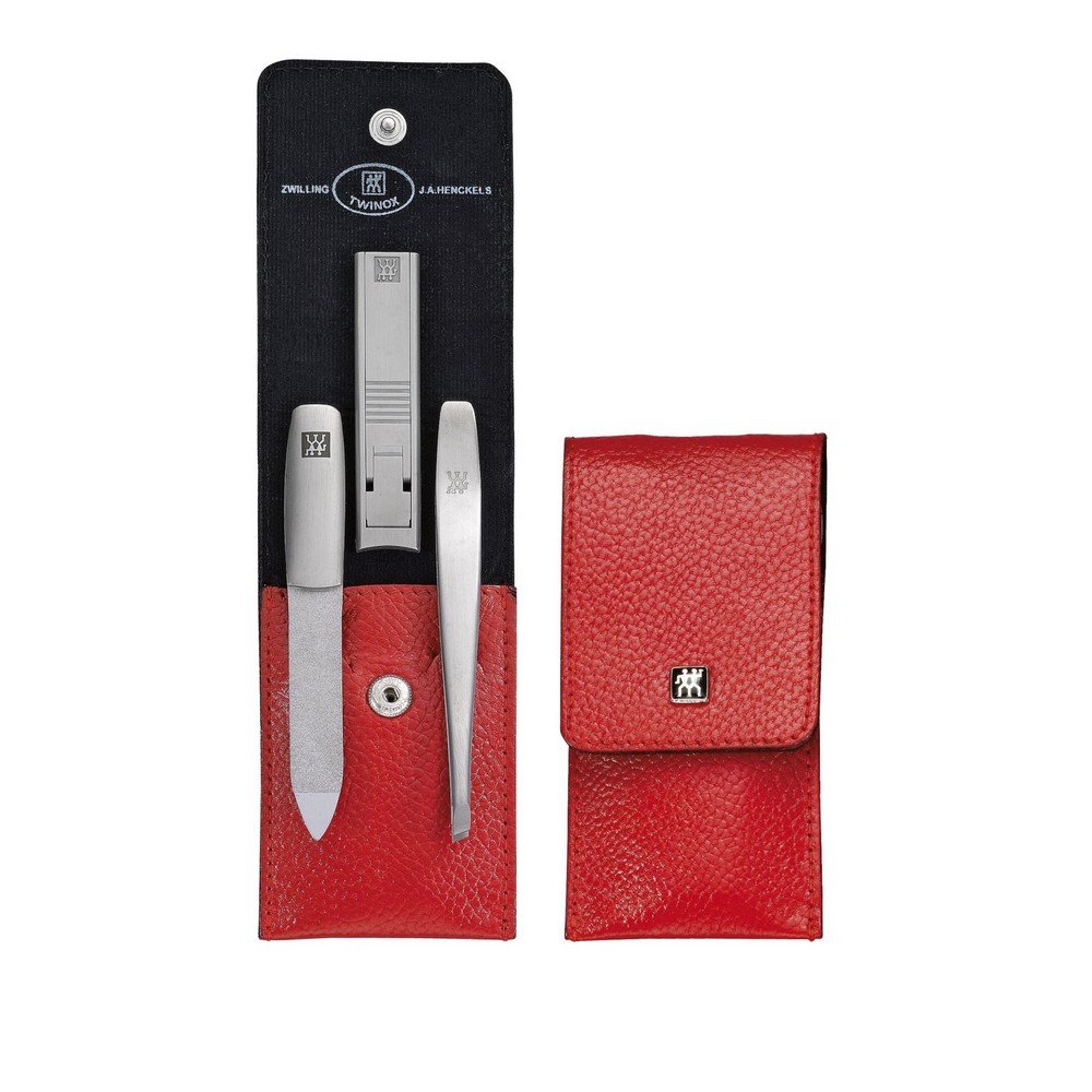 The three-piece professional grooming set from the high-quality Zwilling TWINOX series is compact, practical and versatile for both travel and everyday care. The TWIN® S Nail Crimper, Sapphire Nail File and a pair of Angled Tweezers are stored securely within the velvet-lined interior of the attractive red cowhide case with snap closure. Absolutely precise manufacturing in brushed stainless steel and the ideal ergonomic shape of the tools ensure exceptional durability and functionality in a particularly attractive design.